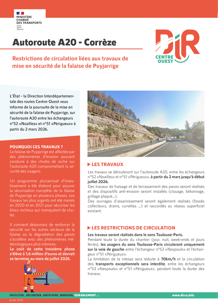 A20 - BRIVE - Restrictions de circulation sur l’autoroute A20 - falaise Puyjarrige