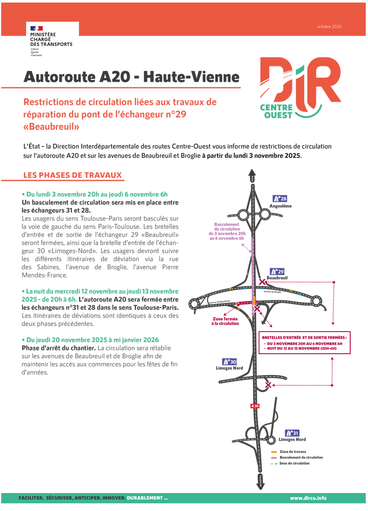 A20 - Restrictions de circulation liées aux travaux de réparation du pont de l’échangeur n°29 « Beaubreuil »