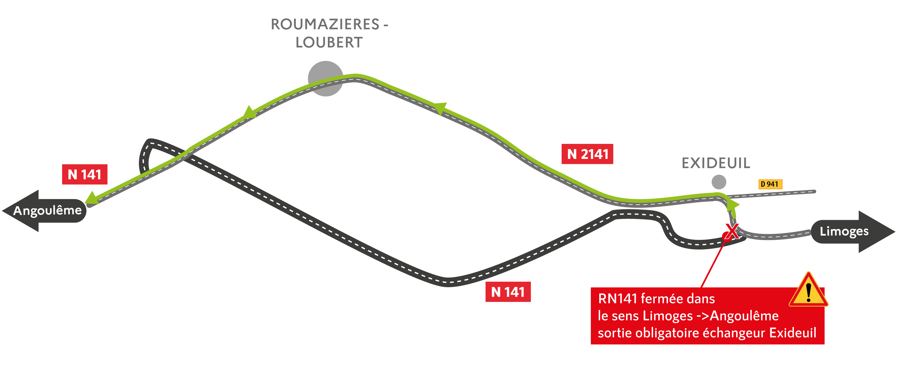 Une déviation sera mise en place par la RN 2141 depuis le diffuseur n°70 « Exideuil » pour rejoindre la RN 141 au giratoire ouest de Roumazières.